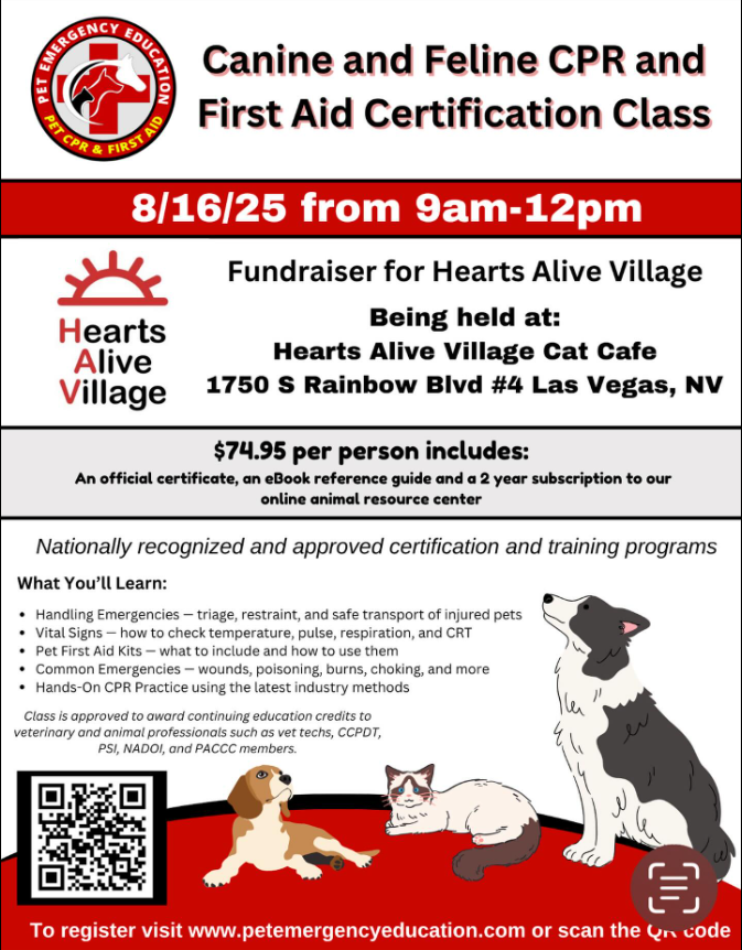 Join us Saturday August 16 from 9-12 at the Hearts Alive Village Cat Cafe for a hands-on Pet CPR & First Aid Certification Class! This is a fundraising for the cat cafe!