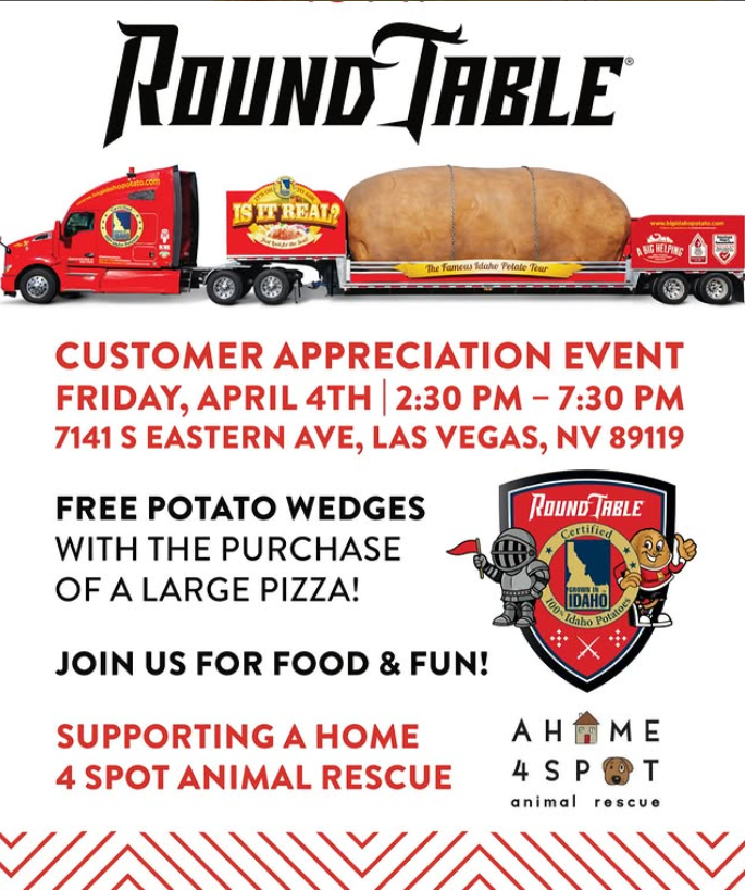 For the first time ever, the world-famous Big Idaho Potato Truck will make a stop at a Round Table Pizza in Las Vegas! This one-day-only event celebrates the delicious partnership between Idaho Potatoes and Round Table Pizza—and yes, the 4-ton spud will be there for photo ops, fun facts, and interviews.