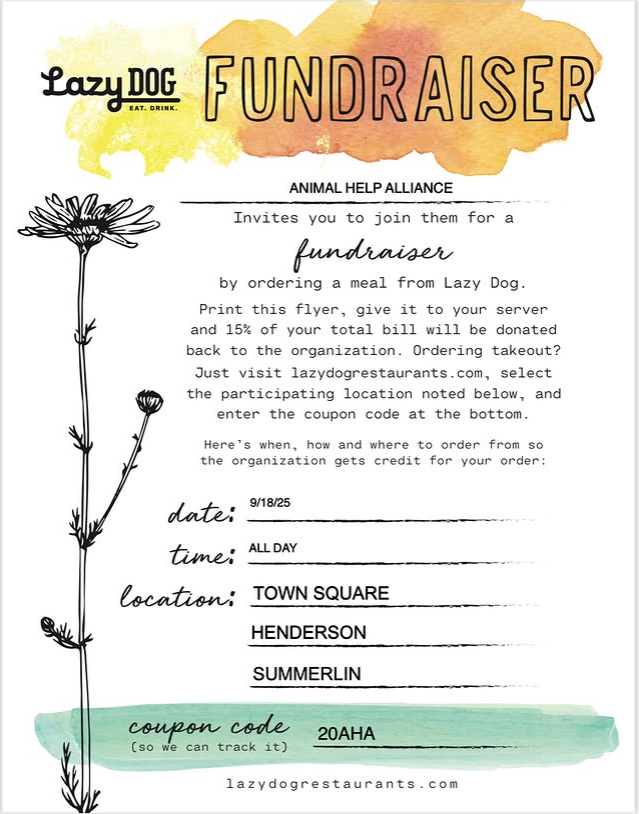 Animal Help Alliance is teaming up with Lazy Dog Restaurant for a fundraiser on September 18th! This is one of the easiest (and tastiest) ways to support our mission of helping dogs in our community. ππβπ¦Ί