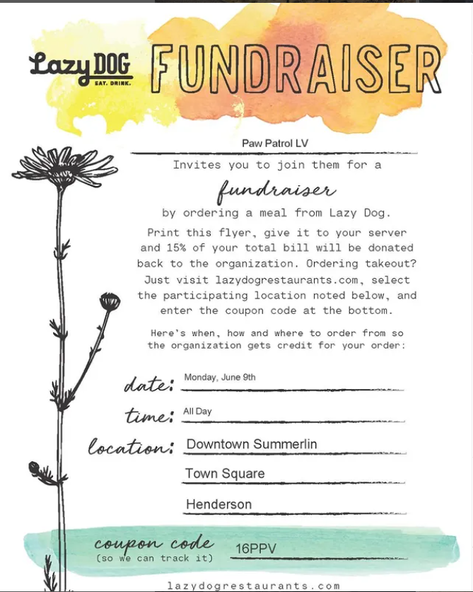 Dine at Lazy Dog on June 9th and use code 16PPV to have 15% of your total bill be donated to Paws Patrol LV!