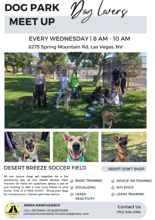 All Lost and Found Animal Foundation rescue dogs get together for a fun socializing day at the Desert Breeze Park every Wednesday! Trainers are on-hand for questions, come on down to hang with your pet or if you're looking to add a new furry friend to your home. This is a FREE EVENT, Bring your dogs for introductions, trainers give free advise.