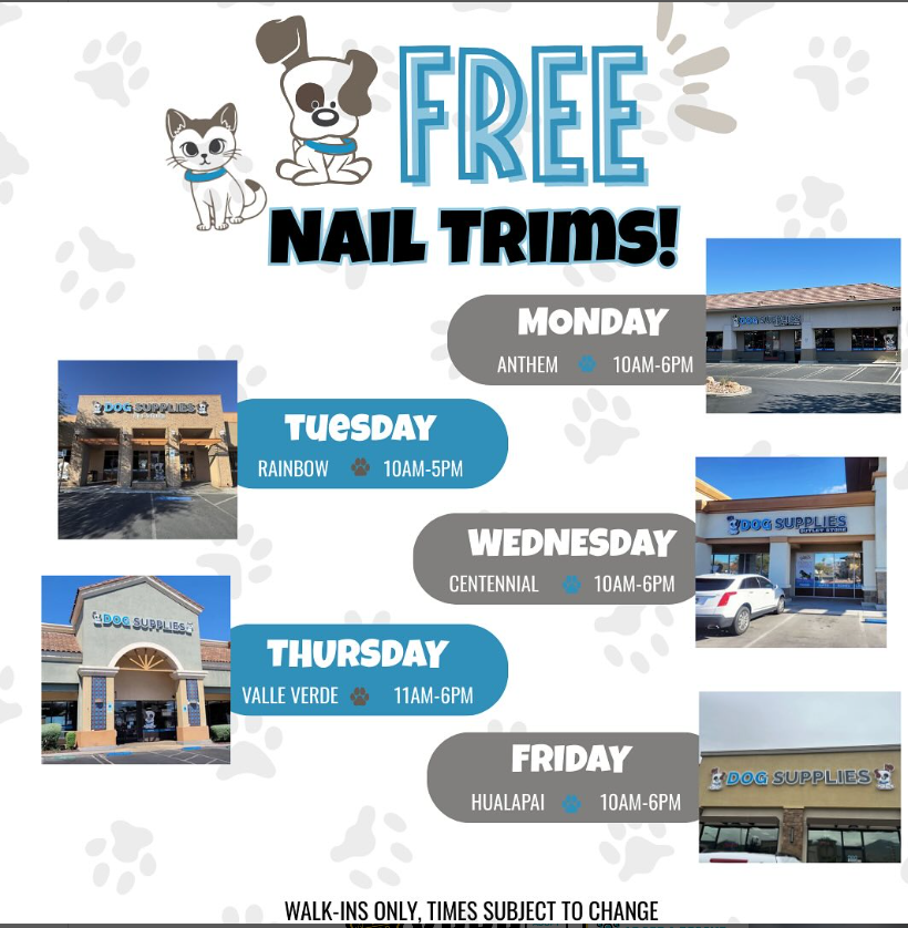 Walk-ins (first come, first serve basis) can get a free nail trim for your pup!
