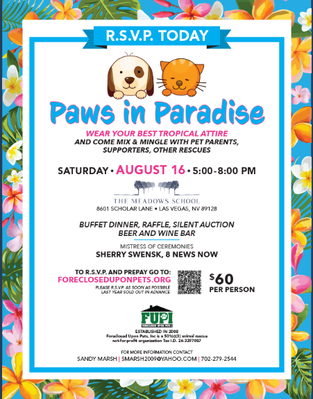 Wear your best tropical attire and come mix and mingle with pet parents, supporters and other rescues@ Buffet Dinner, raffle, silent auction, beer and wine!