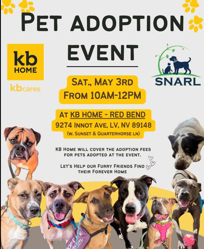 Join KB Home and SNARL for a pet adoption event May 3rd. KB Home will cover the adoptin fees for pets adopted at this event! Visit and help a furry sweetie find a forever home with you!
