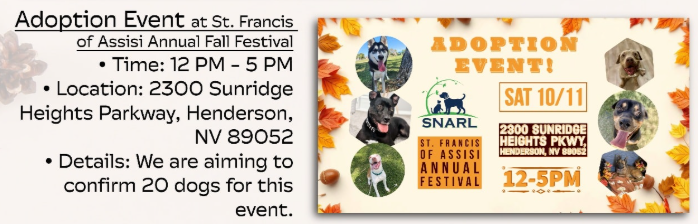 Join SNARL at St. Francis of Assist Annual Fall Festival to enjoy the day and find your new best friend amongst the adoptable dogs!