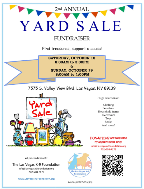 It's the 2nd Annual Fundraiser yard Sale for Las Vegas K-9 Foundation! Find Treasures and support a cause on October 18th and 19th! Huge selection of clothing, furniture, household items, electronics, toys, books and much more!